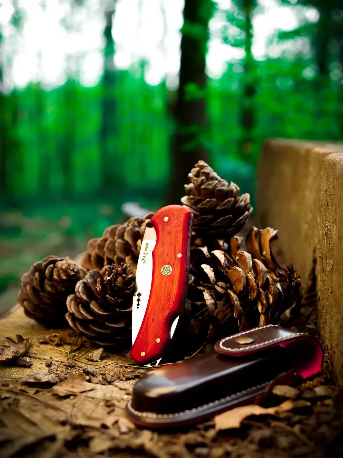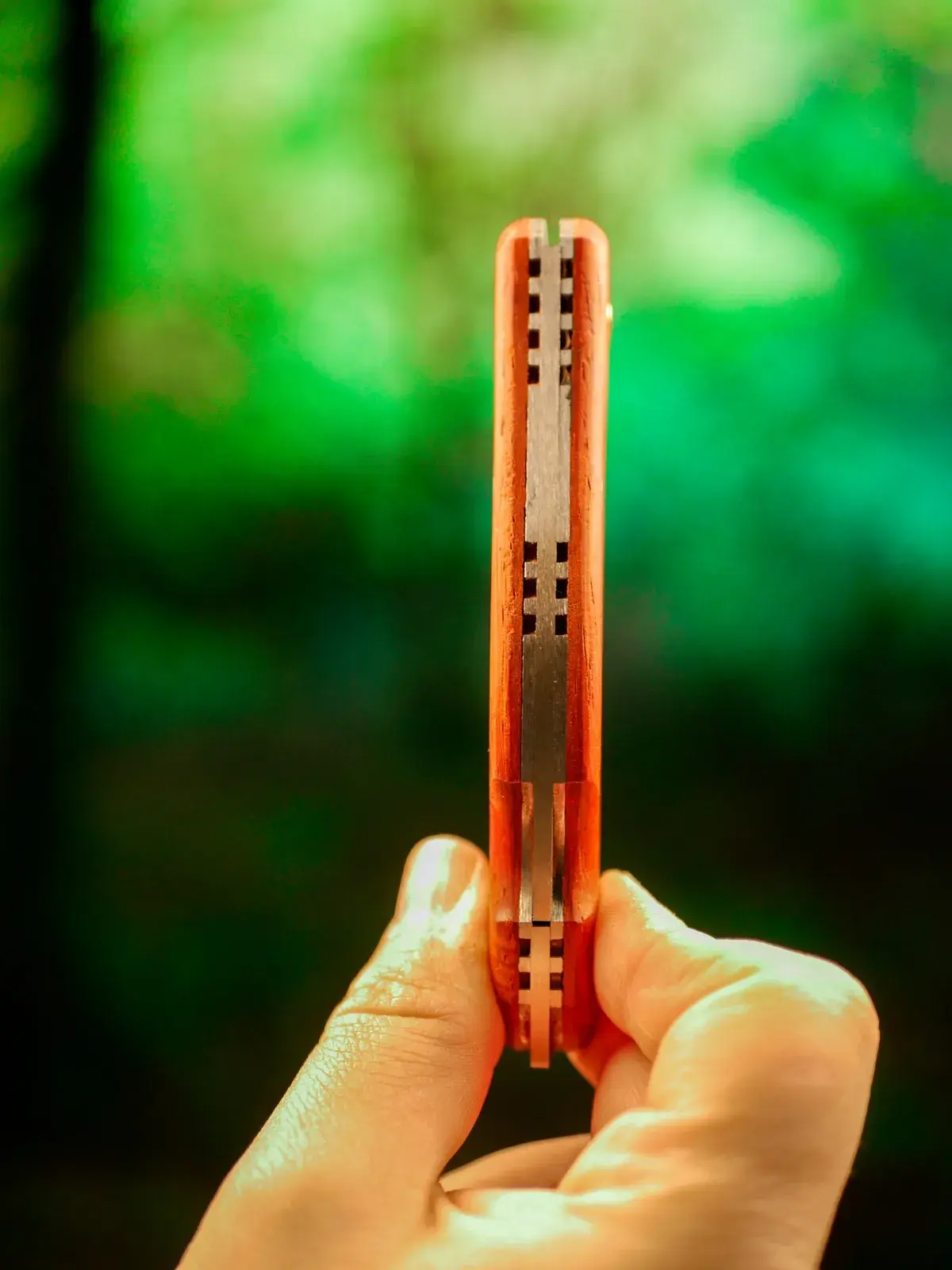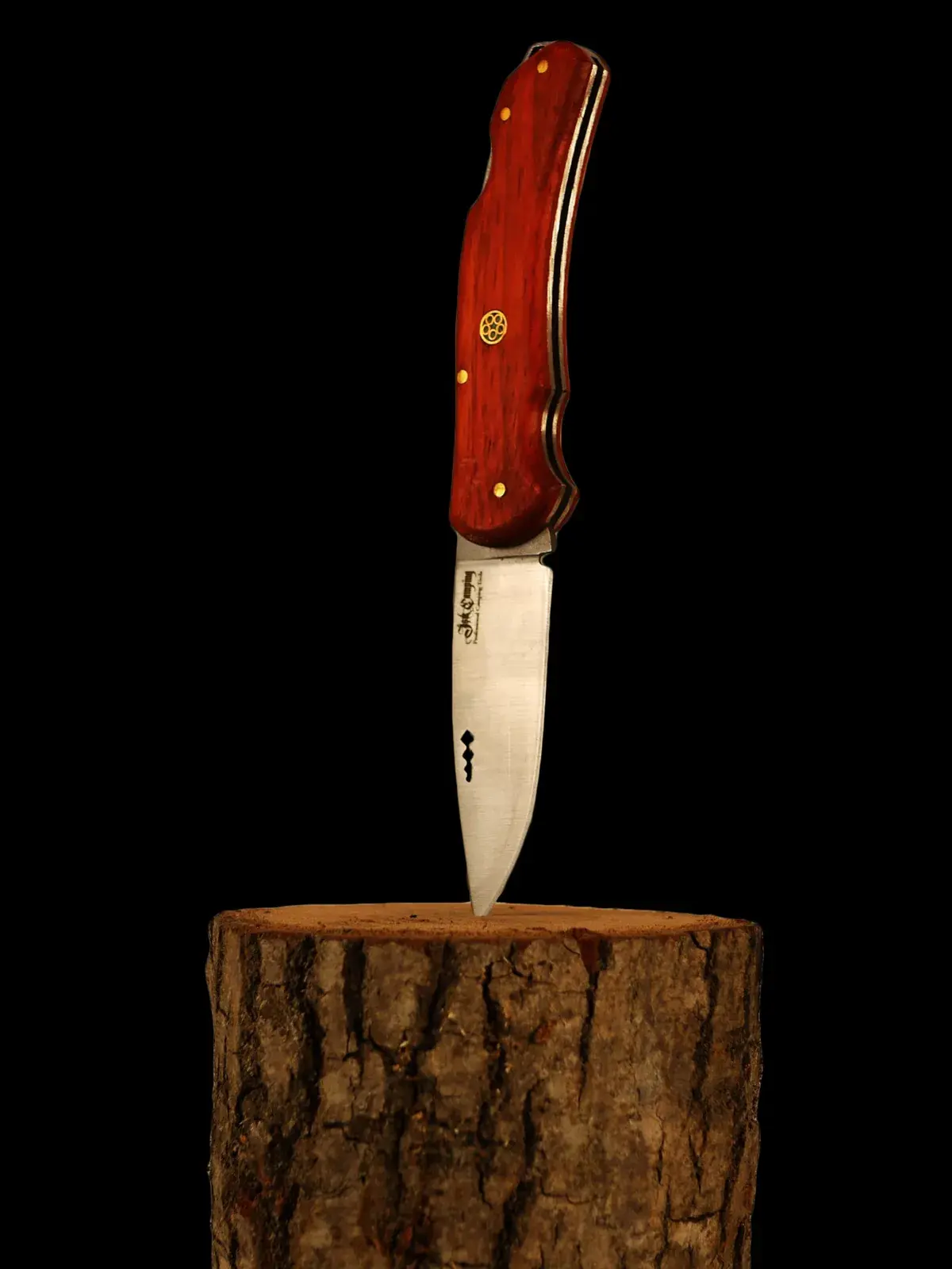 Ahşap sap kısmında kullanılan paduk ağacı, doğal ve estetik görünümü ile öne çıkar. Kamp çakısı, ergonomik tasarımı sayesinde elde rahat bir tutuş sunar ve uzun süreli kullanımlarda konfor sağlar.